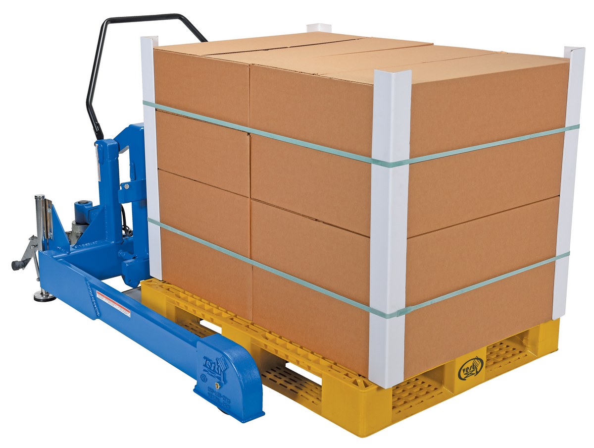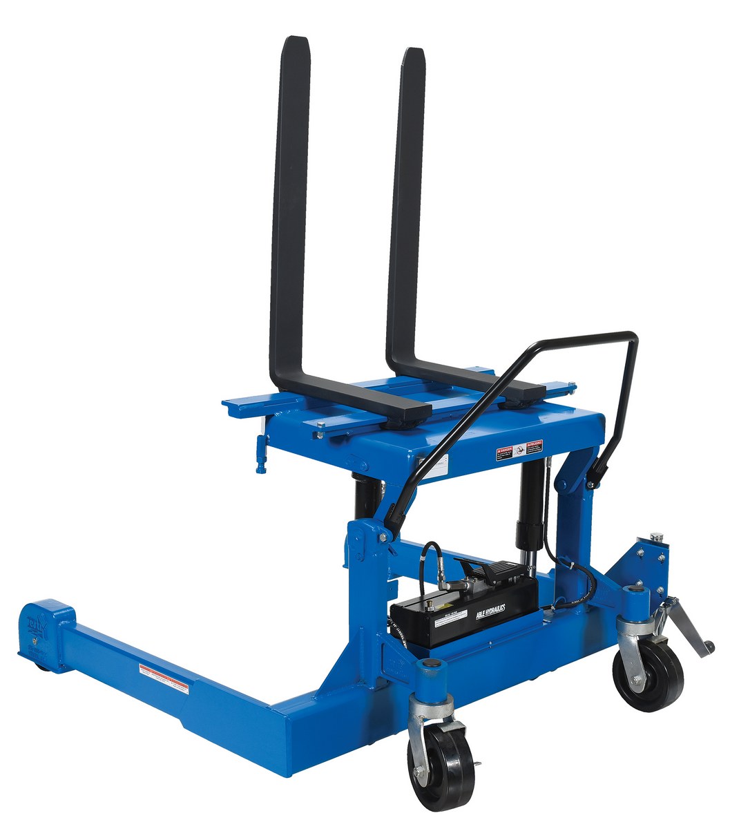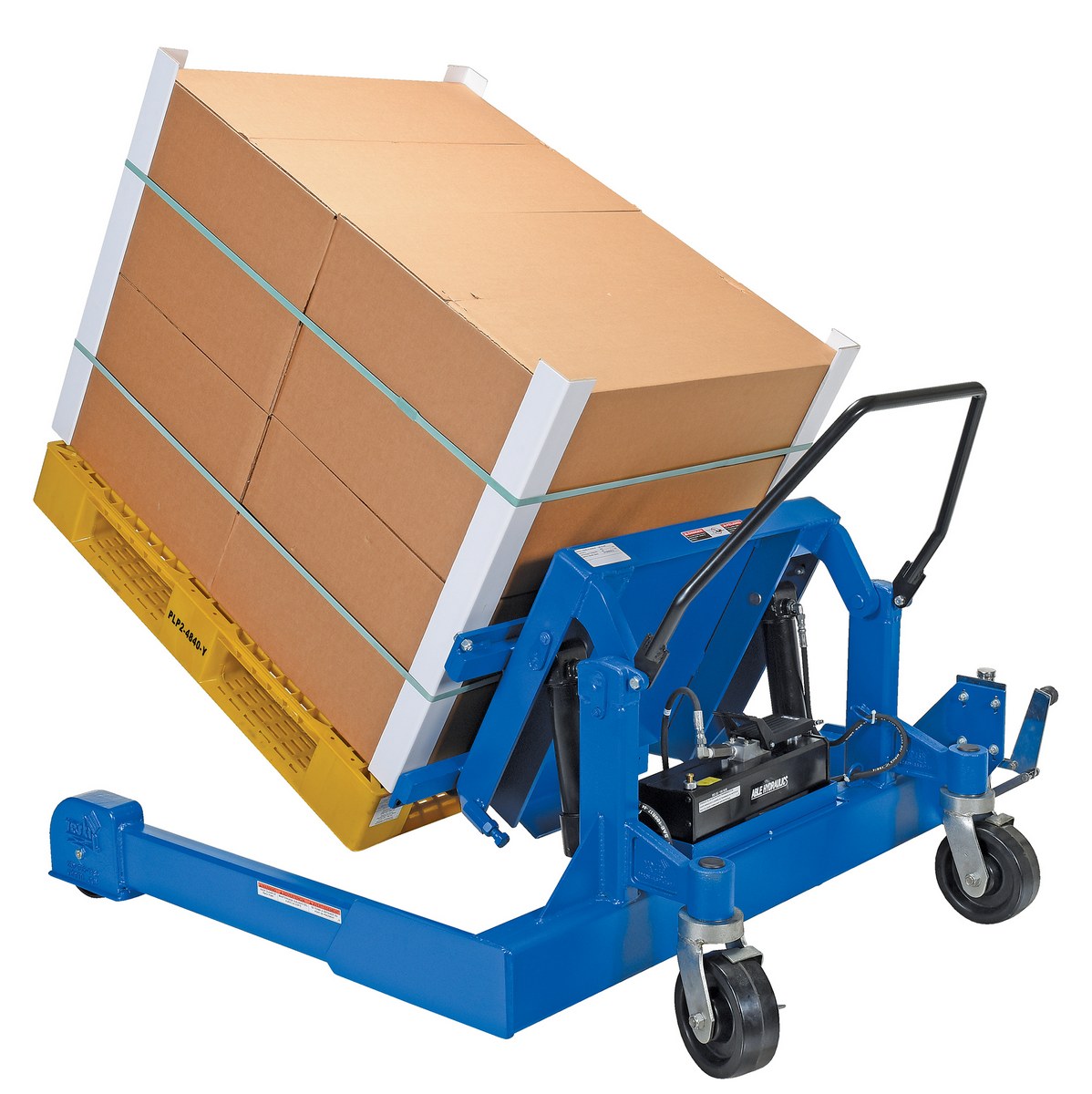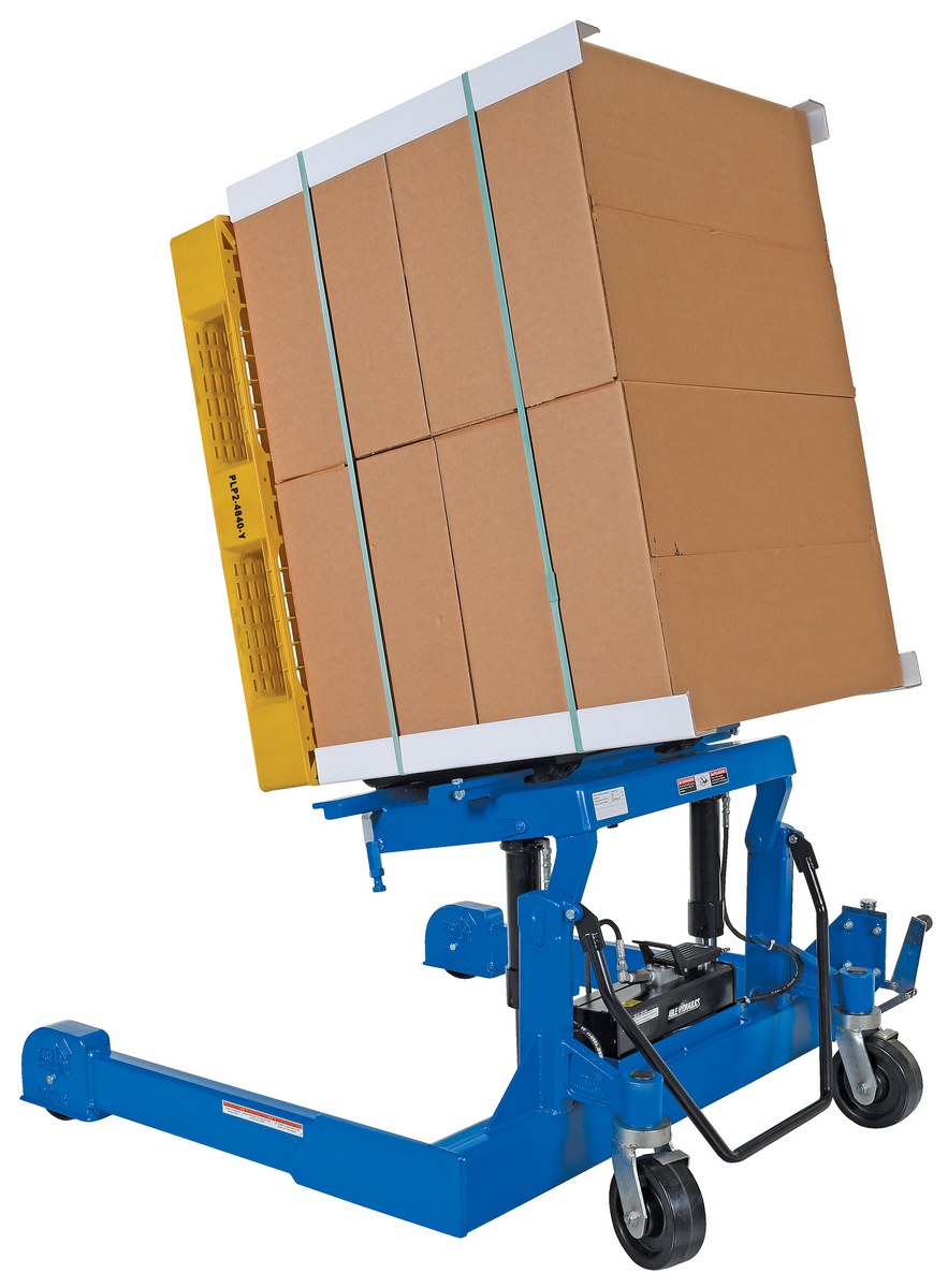 Steel Tilt Master Straddle Reciprocating Air/Oil Power 2,000 Lb. Capacity BlueThe tilt master straddle lifts and positions filled tote boxes or baskets without the need of a fork truck or lift table using the newly designed heavy-duty tilt master. The tilter will function as transporters by moving completed products from work station to work station without waiting for a fork truck. This lift has a thin profile to allow the user to get as close to the load as possible. It also has a standard floor lock and rolls easily on the phenolic steering wheels. Lift is designed to be used with virtually any kind of container or pallet. The unit is powered by an air pneumatic motor.