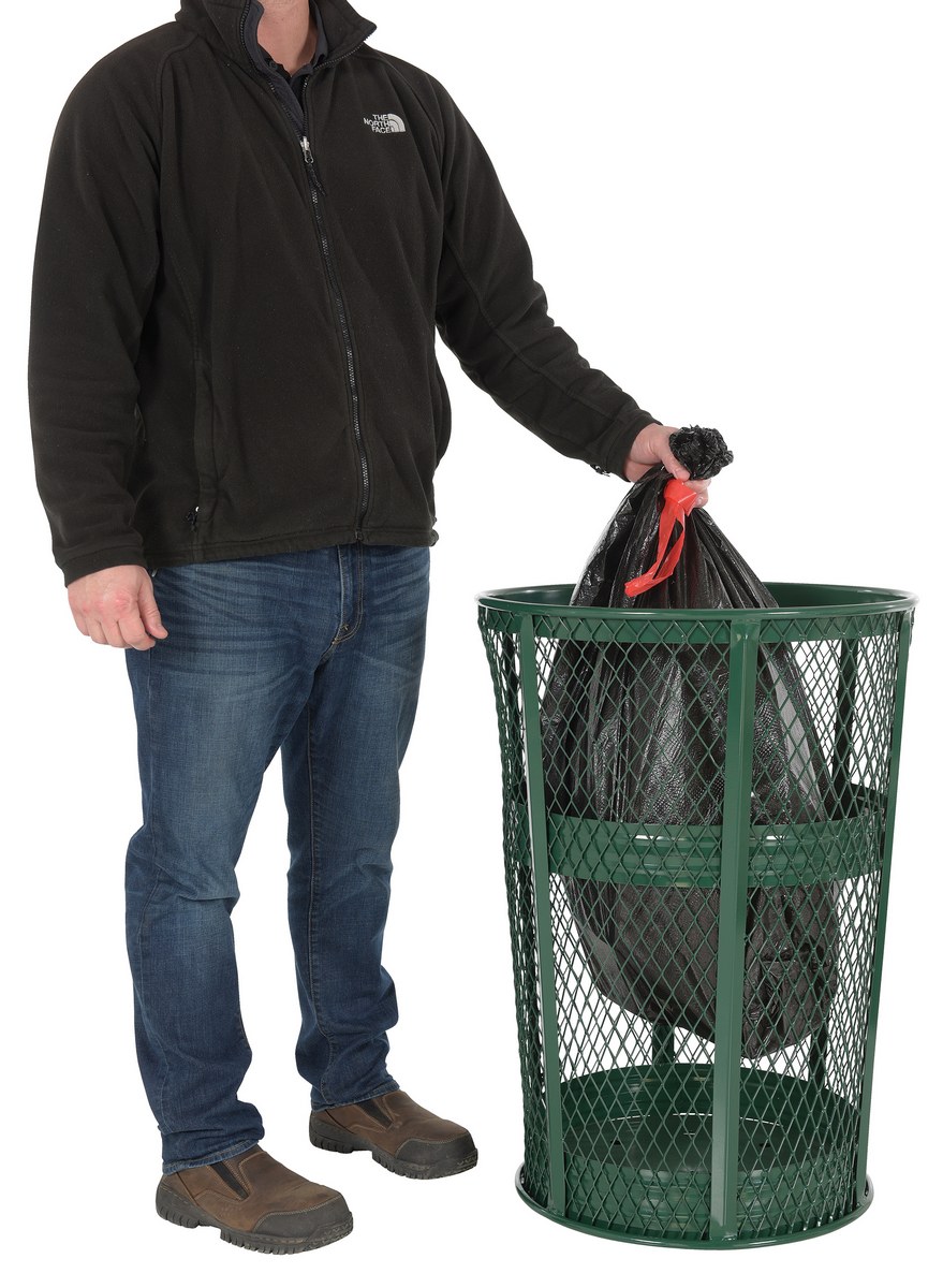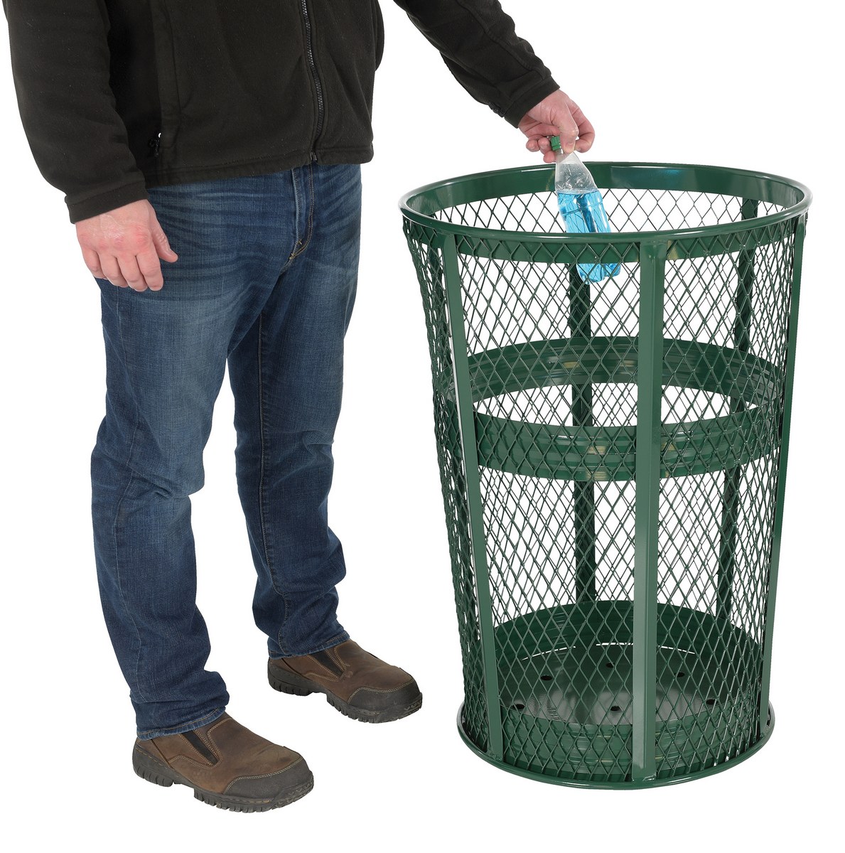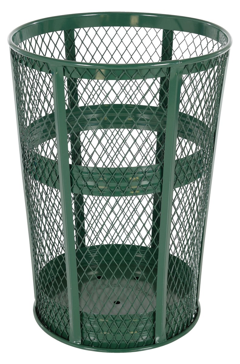 Steel Trash Receptacle Round 48 Gallon GreenThe expanded metal trash cans are perfect for a variety of settings. The mesh style metal design allows for the amount level to be determined easier and allow for an easier cleanup. The strong, yet lightweight, construction withstands adverse conditions on a consistent basis and be moved easily without the need of extra personnel when empty. Available in a variation of colors.