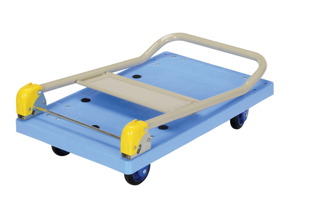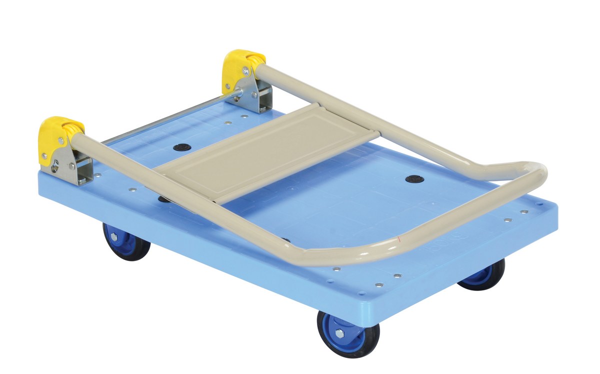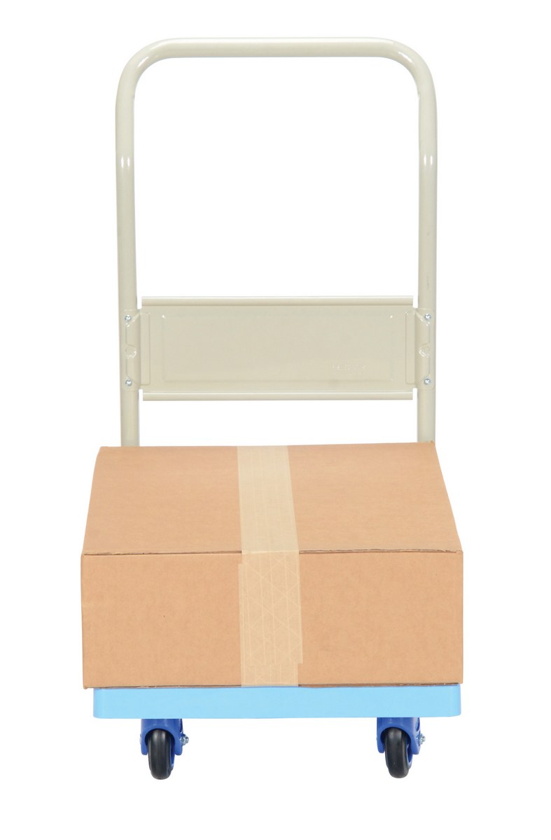 Plastic Truck Folding Handle 27-7/8 In. x 17-7/8 In. x 34 In. 330 Lb. Capacity BlueThe plastic platform cart is a great addition to the shipping and distributing facilities. The plastic platform creates a durable, yet lightweight construction that can be transferred simply from workstation to workstation. The unit rolls on casters for smooth transference over a variety of terrains. The attached handle creates a more ergonomic posture of personnel during use.