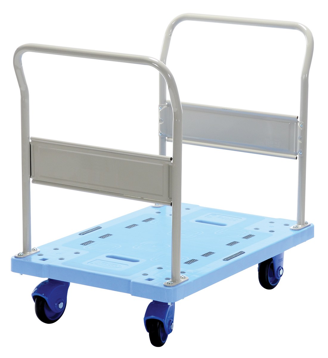 Plastic Truck Dual Handles 35-1/4 In. x 23-5/8 In. x 34-3/8 In. 660 Lb. Capacity BlueThe plastic platform cart is a great addition to the shipping and distributing facilities. The plastic platform creates a durable, yet lightweight construction that can be transferred simply from workstation to workstation. The unit rolls on casters for smooth transference over a variety of terrains, while the side nets enable the utmost security. The double handled design creates a more ergonomic posture of personnel during use.