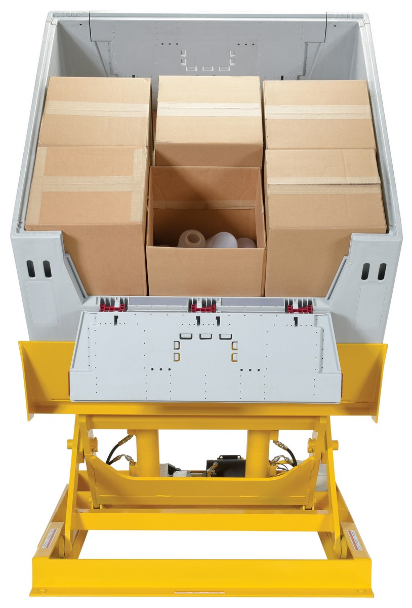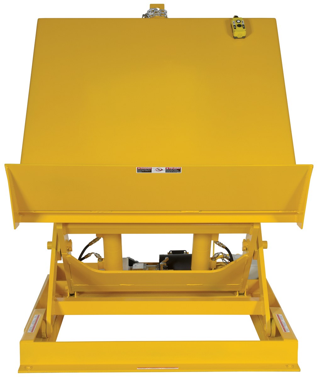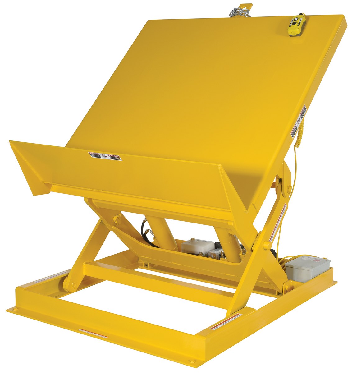 Steel Ergonomic Lift/Tilt Table 48 In. x 48 In. 460 Volt 3 Phase 4,000 Lb. Capacity YellowThe lift & tilt workstation table allows platform to lift & tilt at the same time for easy operation. The platform end includes a high full width lip to support containers. The internal power unit includes electric motor, hydraulic pump, and control box. It includes a two-button hand held pendent control with optional voltages available. The welded steel construction has a yellow painted finish.