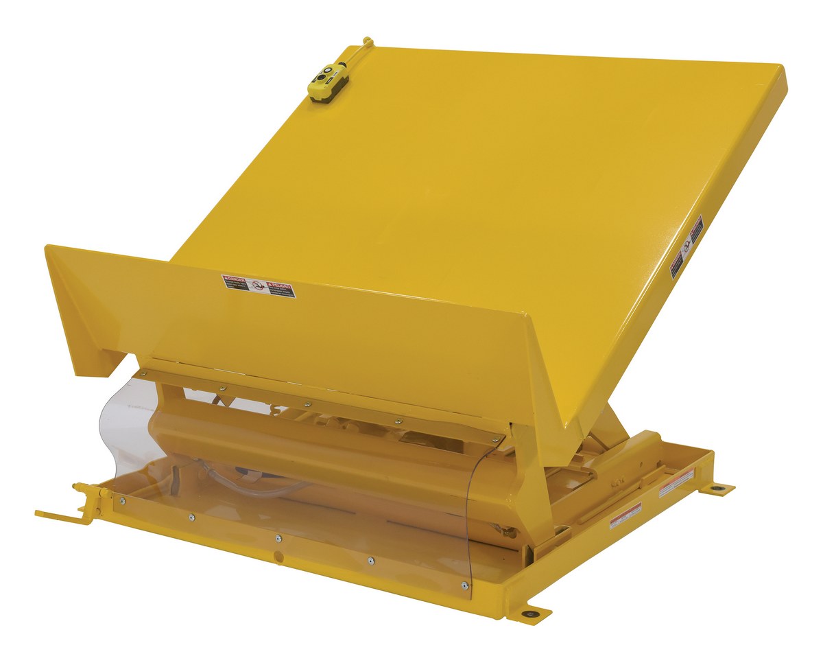 Steel Lift Table 48 In x 48 In AC Powered 460 Volt 3 Phase 6,000 Lb. Capacity YellowThe single scissor lift & tilt table is designed to position containers within easy reach of assembly line workers and machine operators. The unique design reduces fatigue by minimizing repetitive bending and stretching required to obtain components from containers. This scissor table comes with a high lip on the tilt side which makes it ideal for parts transfer and assembly. The selector pedal allows the operator to lift while tilting, or tilt then lift. The motor is totally enclosed standard with optional voltages available. Other standard features include: a two-button handheld control, integrated maintenance lock, pressure plated pump, pressure compensated flow valve, lowering valve, independent oil return, and an adjustable upward travel switch. Scissor table must be lagged to the floor.