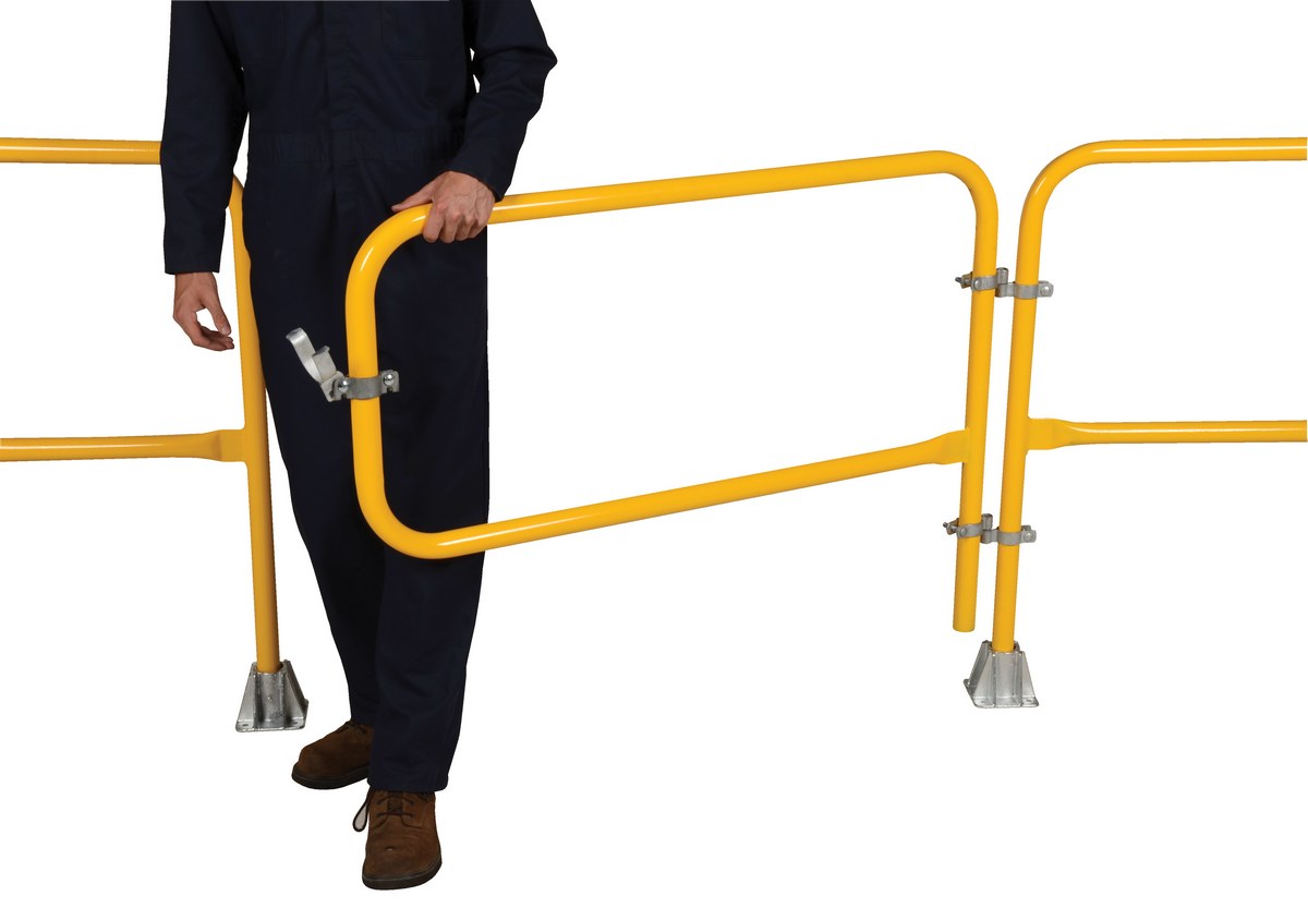 The steel gate works great as an addition to the pipe safety railing. The steel construction is durable and visible with a yellow finish. Hardware for simple installation is included.