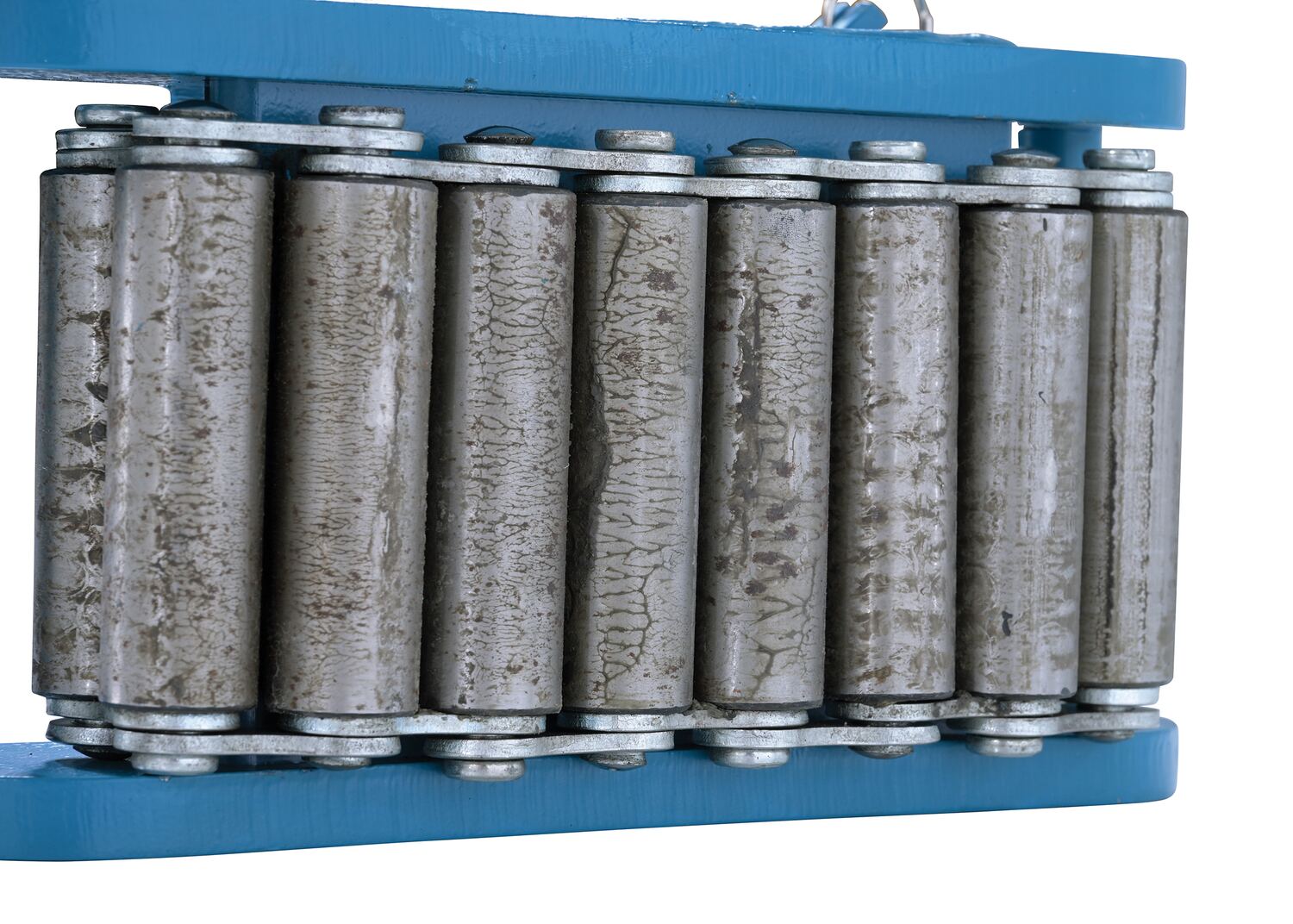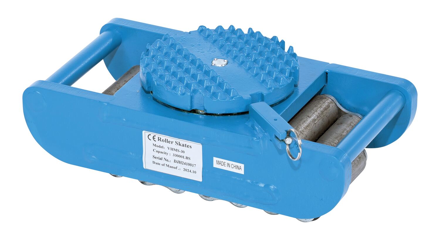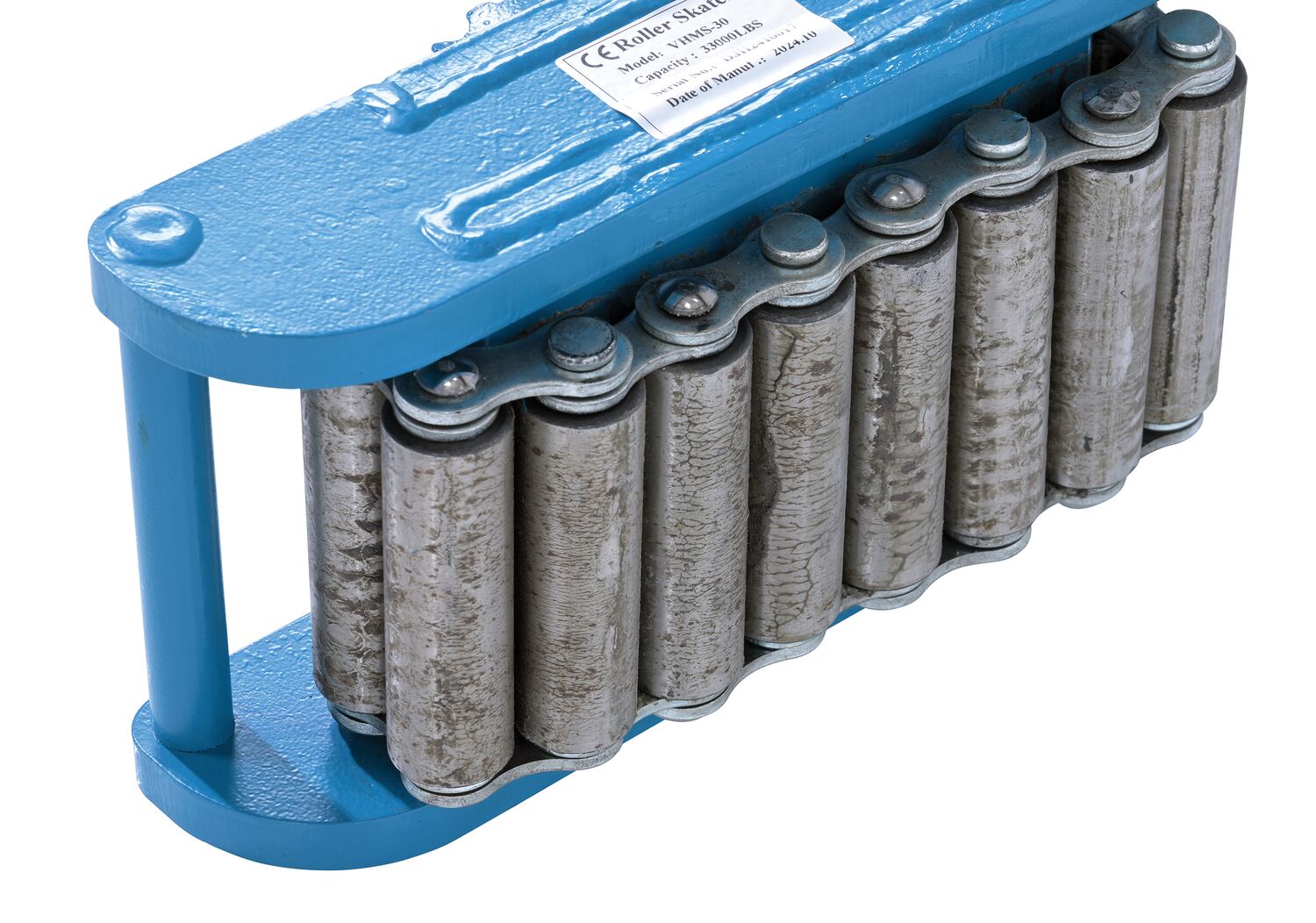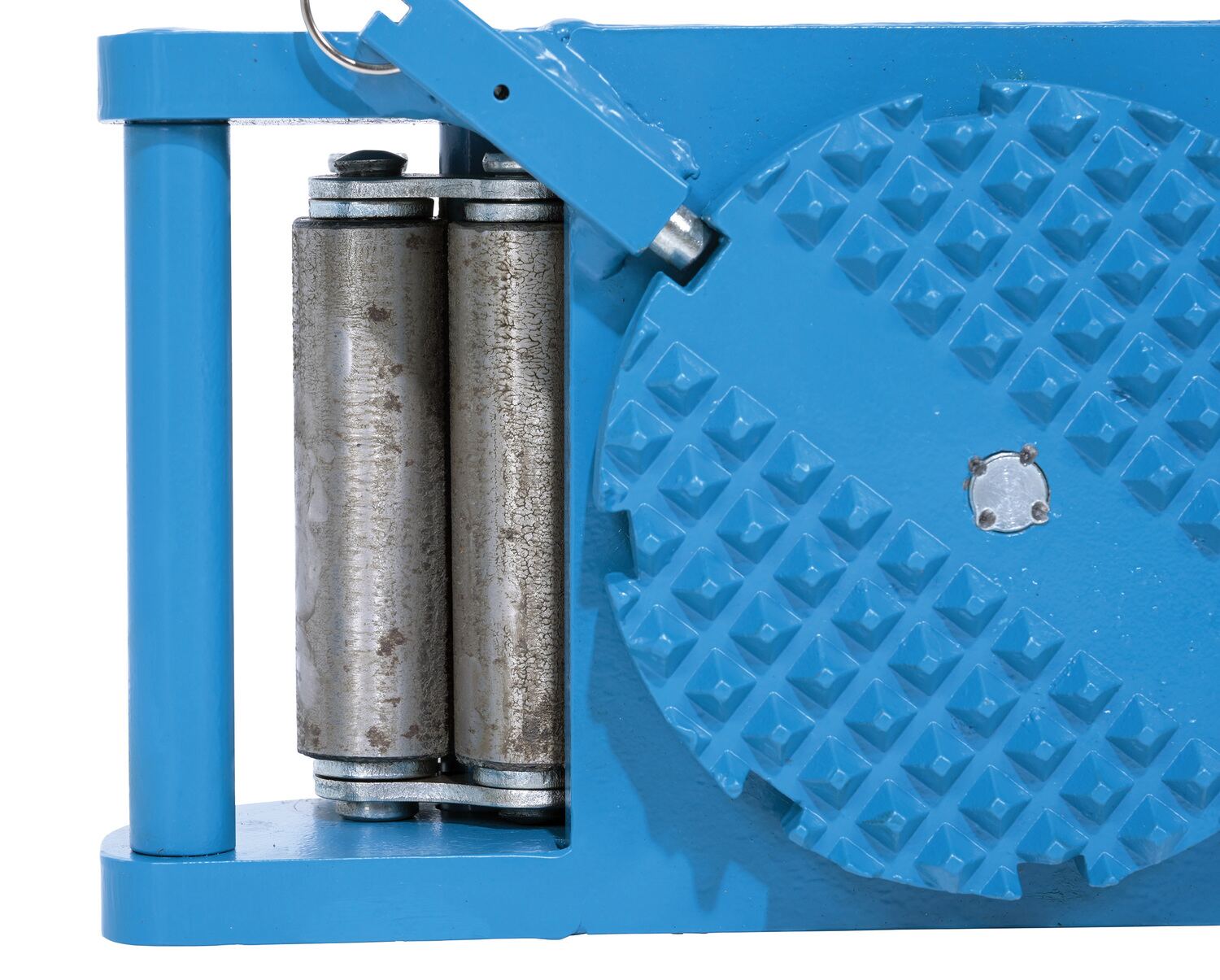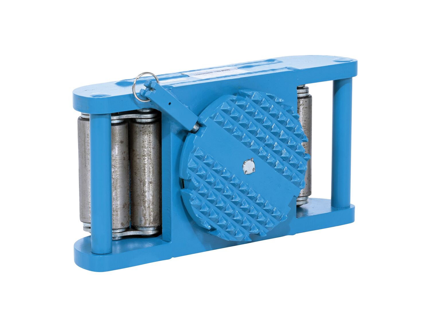 Steel Machine Roller 33,000 Lb. Capacity BlueMade of high-strength annealed ductile iron, this steel machine roller has swivel tops that rotate three hundred sixty degrees (360 degrees) on chrome steel ball bearings to allow for easier turning. The rollers form a "tank track" to revolve around a center load bearing plate in the frame to provide maximum maneuverability. The weight of the load is transferred directly from the load bearing plate to the rollers, eliminating axle friction and requiring less power to start and move. This unit is virtually maintenance free.