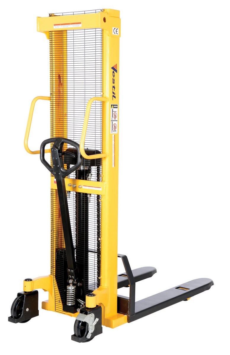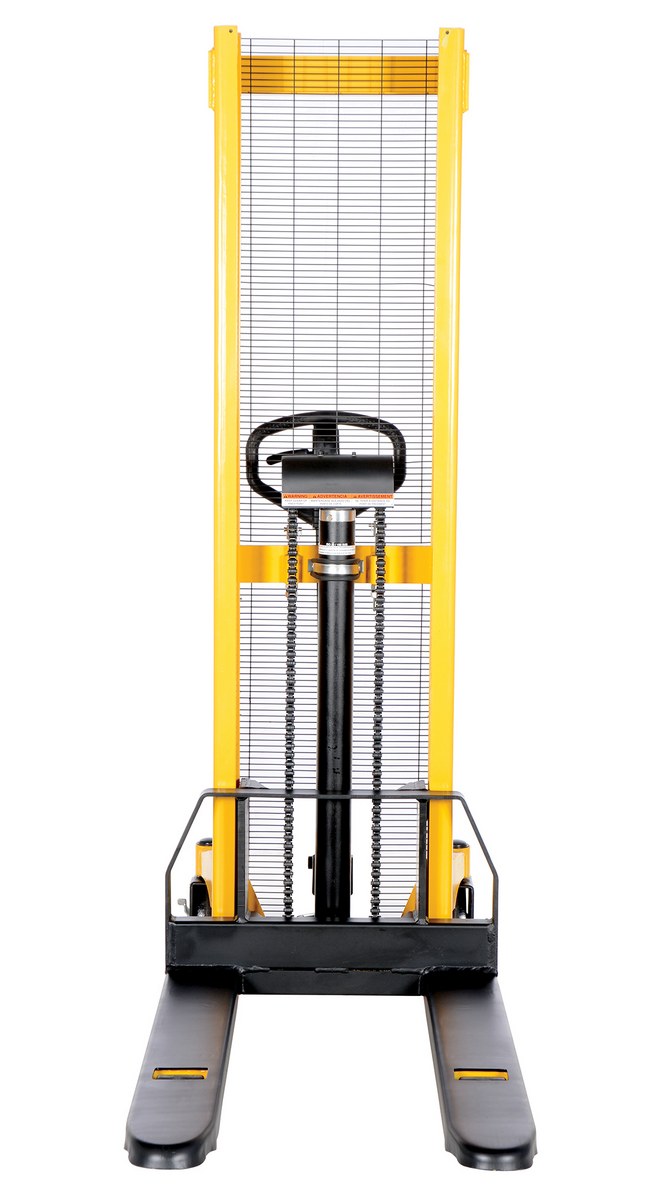 Steel Manual Stacker Fixed Forks/Legs 2,000 Lb. Capacity Black / YellowThe manual stacker is designed to meet the most challenging tasks. Ideal for use in various workstation and workplace applications. Maintenance free and easy to use. The full height push handle allows for easy steering and excellent visibility through a welded mesh guard with an optional removable platform available. The Hydraulic hand pump is sturdy and compact to fit through standard doors. The forks are raised by manual hydraulic hand pump operation and released by a lever situated on the handle. The unit has two (2) rigid and two (2) swivel wheels standard.
