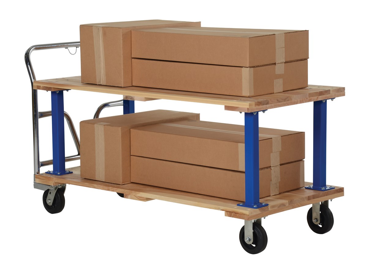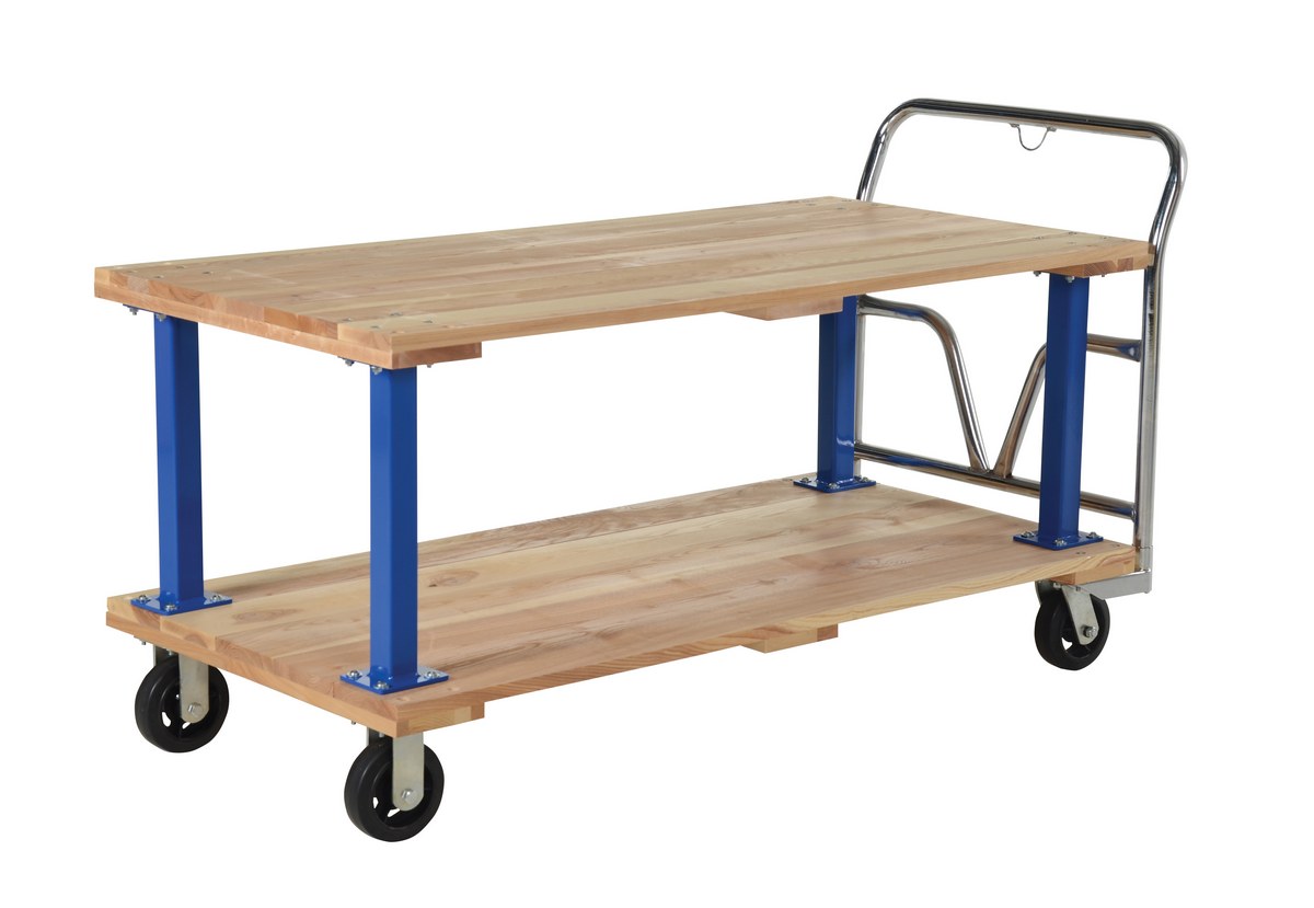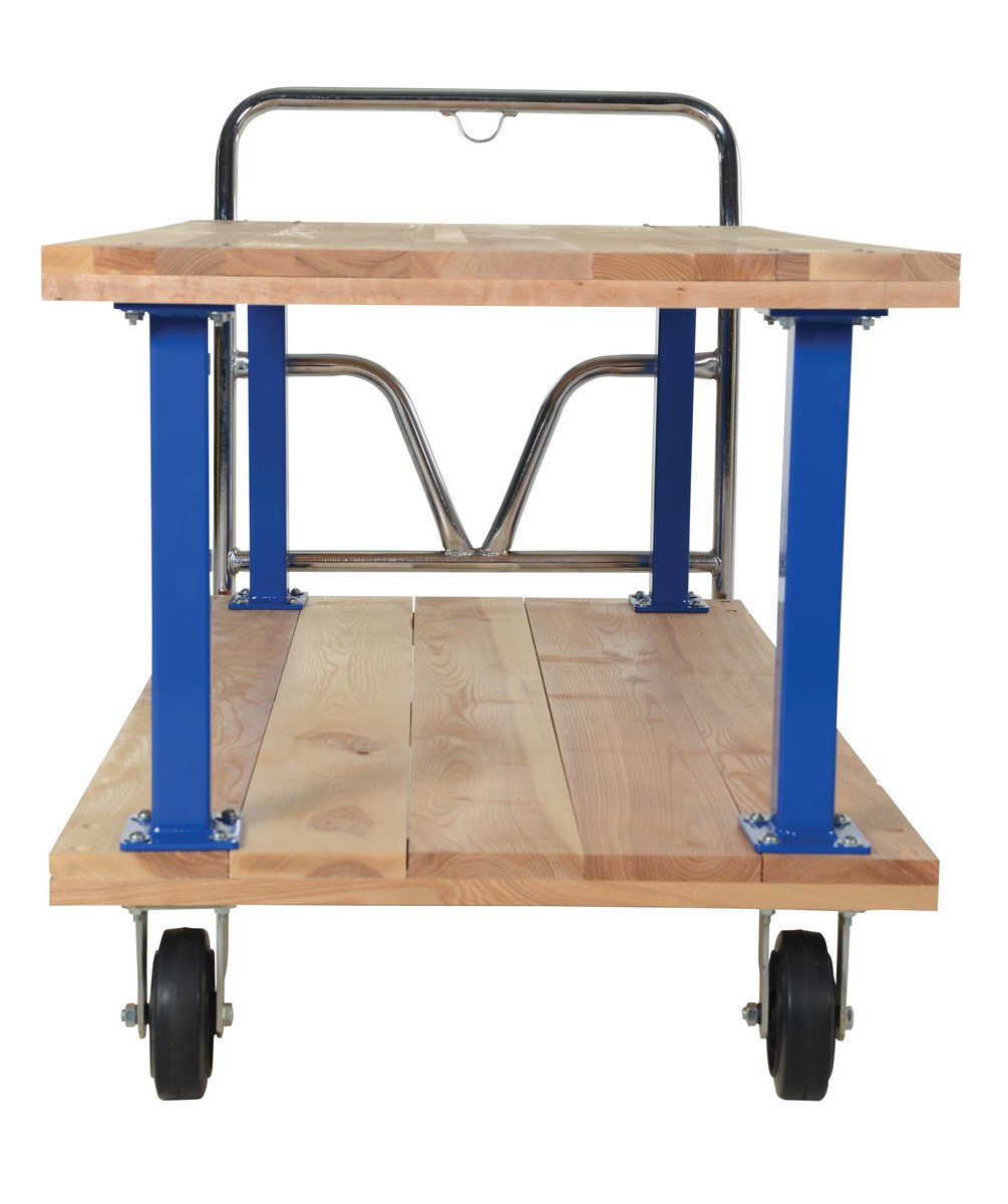 Minimize lifting and bending with this double decker Hardwood platform cart/portable work bench. Ideal for shipping areas, offices, and plant use, these economical carts are perfect for many of your applications. Removable push handle is chrome plated. Countersunk holes allow for a smooth deck surface.