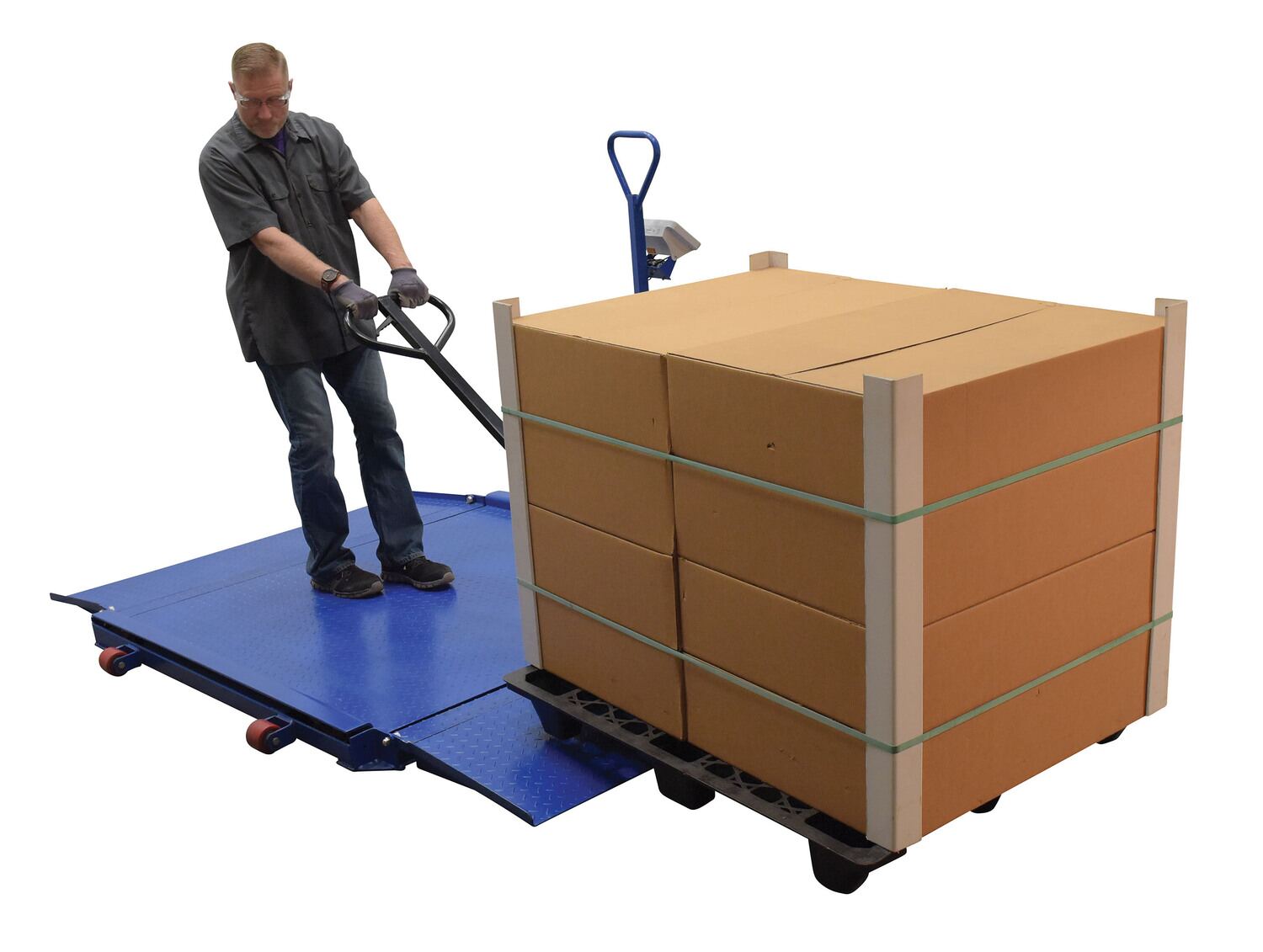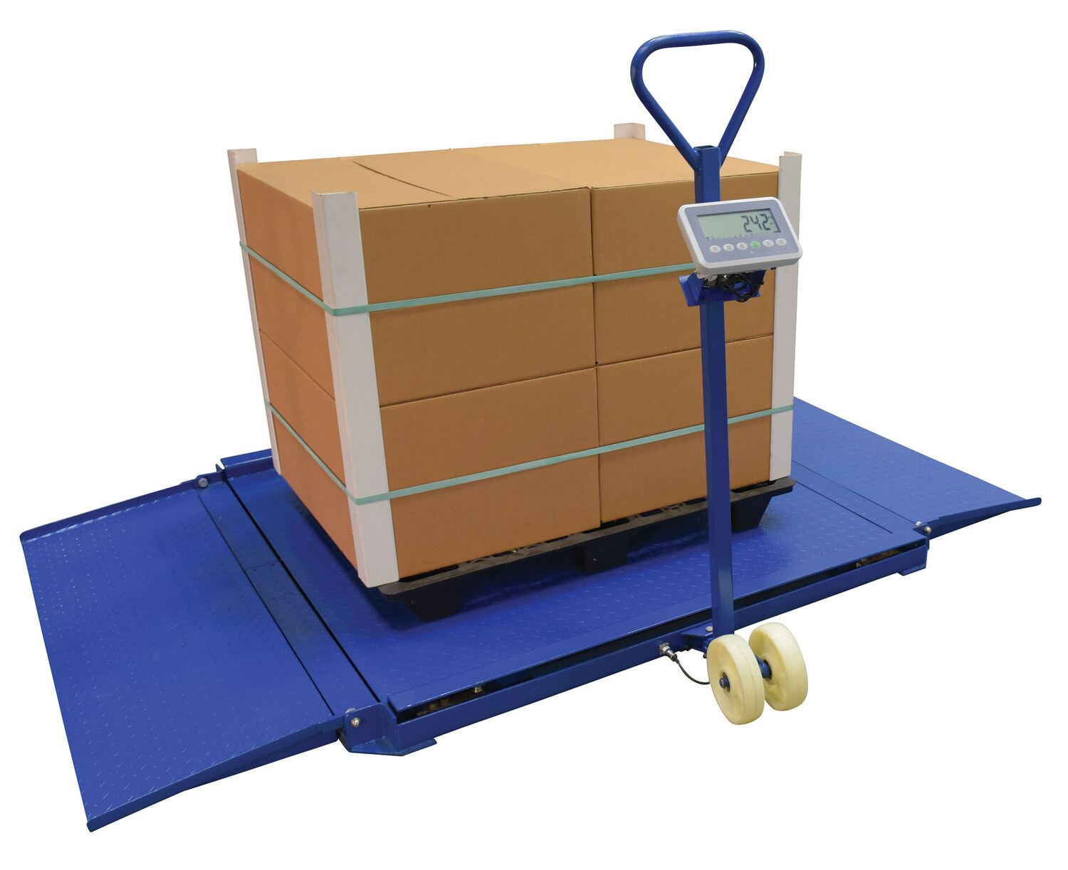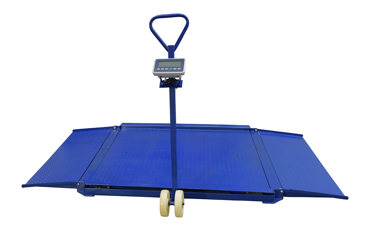 The portable floor scale is ideal for easy transportation and weighing of goods at multiple locations. The scale has a non-slip diamond plate surface. Fold down low gradual ramps are fixed to the platform. Ramps make the scale ideal for wheeling pallet trucks, dollies, carts and containers on and off the platform. Four (4) alloy steel load cells and deluxe indicator head. Supplier flat pack for easy assembly.