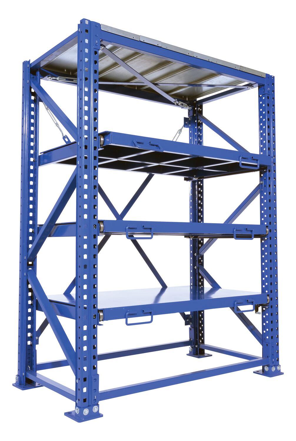 Steel Heavy Duty Roll-Out Shelving 32L X 60W X 80H 3,000 Lb. Capacity BlueHeavy Duty roll-out shelving supports and stores heavy dies, fixtures and machinery. Shelves should be rolled out one at a time for simple product placement, as well as, personnel safety. All steel construction with powder coat finish. Mounting holes are pre drilled. Assembly hardware is included. Mounting hardware is available separately.