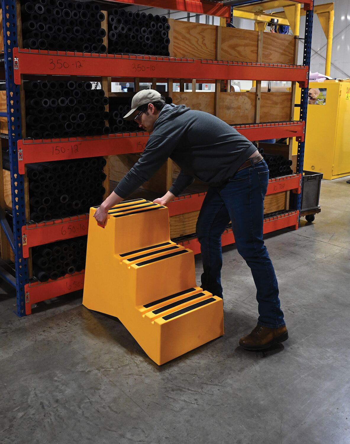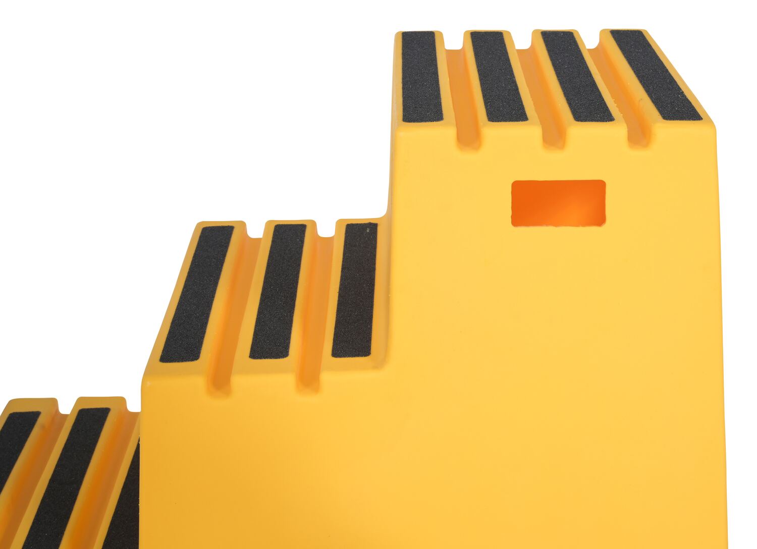 When items are out of reach, do not strain, simply step up with this Polyethylene step stool. The three (3) step unit has rear opening access storage compartments. This stool has rubber feet and a non-skid tape surface. Hand holes are standard for easy one person transportation.