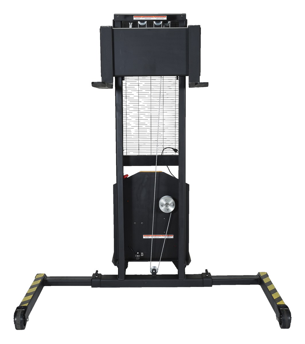 Steel Stacker with Adjustable DC Powered Winch 770 Lb. Capacity Black / YellowThe electric winch stacker features a heavy duty mast and a DC winch for easier and safer lifting. Lift and lower by DC winch and steel cable mechanism. A full height push-handle is included for easy steering and excellent visibility through welded mesh guard. The unit rolls smoothly on two rigid and two swivel wheels with brakes for easy maneuvering.