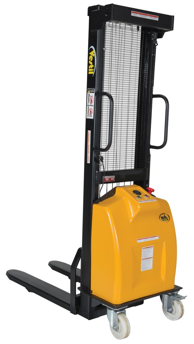 Steel Stacker with Fixed DC Powered Winch 770 Lb. Capacity Black / YellowThe electric winch stacker features a heavy duty mast and a DC winch for easier and safer lifting. Lift and lower by DC winch and steel cable mechanism. A full height push-handle is included for easy steering and excellent visibility through welded mesh guard. The unit rolls smoothly on two rigid and two swivel wheels with brakes for easy maneuvering.