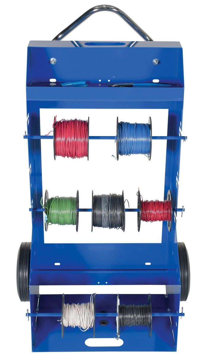 Portable Steel Cord Reel Caddy 300 Lb. Capacity BlueThis portable wire reel caddy is designed to easily move wire reels where you need them the most. Dispense wire in vertical or horizontal position. Includes four (4) spool bars for handling various size reels. Bottom of caddy includes wire guide holes for quick access. Bolt-on push handle and casters for smooth ergonomic transporting.