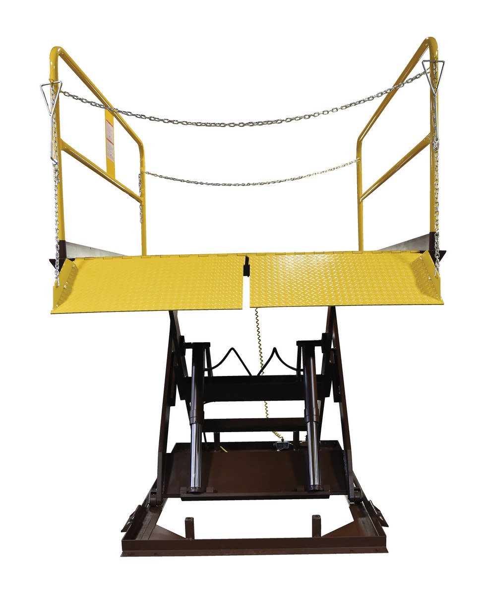 Save time and reduce man-hours where there are no docks with a truck scissor dock lift. Engineered and designed for maximum safety and efficiency. The diamond plate deck is made of heavy gauge steel for years of use. Hydraulic cylinders feature safety velocity fuse if line breaks. It comes complete with upper travel limit switch and overload relief valve. The push-button control is on a long coil cord. Pre-wired control box includes magnetic starter and overload fuse. High visibility safety yellow removable handrails with fixed toe boards are standard. Includes beveled toe-guards and electric toe-guards around perimeter of platform. The external motor can be located up to eight (8) feet away from lift.